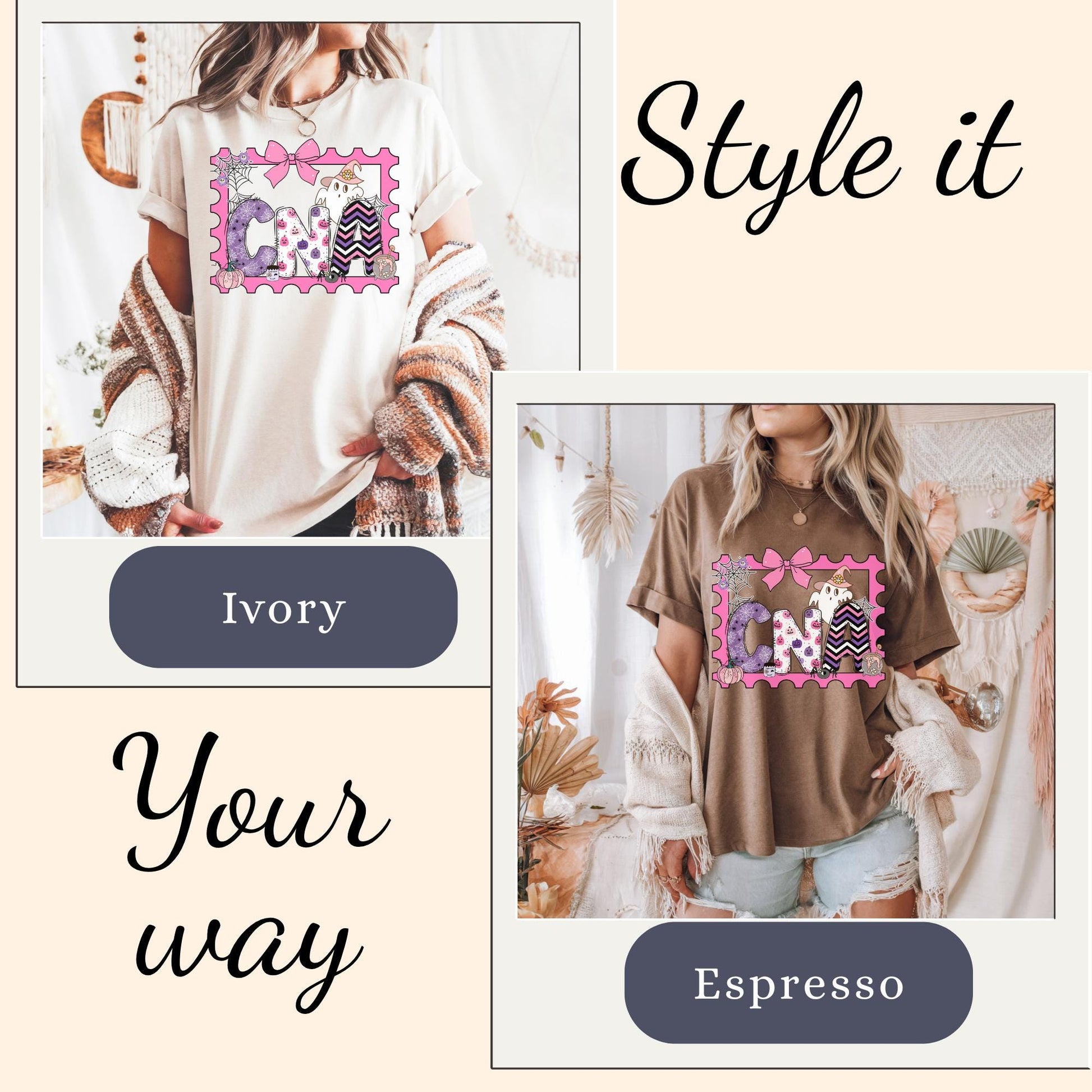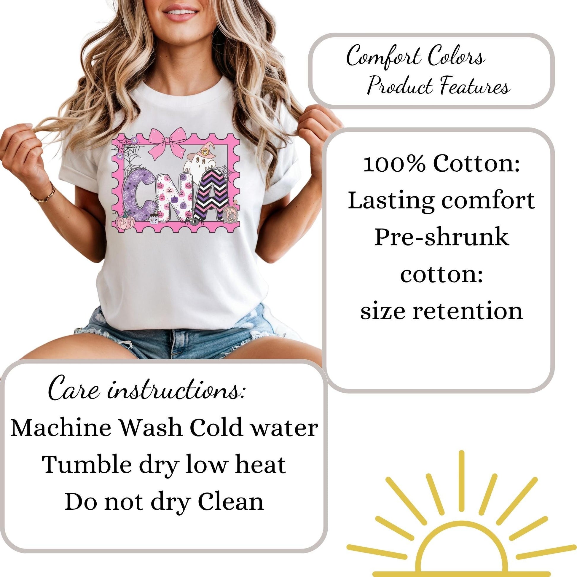 This CNA Halloween spooky cute coquette t-shirt makes the perfect gift idea for fall. Designed for nurse assistants, this comfort colors tee features a ghost and pumpkin stamp design in a retro autumn gift style. Product Features • Comfort Colors 1717 unisex relaxed fit • 100% ring-spun cotton for ultra-soft feel • Garment-dyed for a vintage, lived-in look • Double-stitched sleeves and bottom hem for durability • Soft-washed and pre-shrunk to minimize shrinkage • Available in multiple trendy colors • Printed with high-quality professional inks Perfect For • Nurse Halloween • School nurse • Registered nurse • Fall nurse outfit • LPN RN Nurse • Comfortable everyday wear for healthcare workers Sizing Information • True unisex relaxed fit — size down for a more fitted look or size up for an oversized style • Please refer to the size chart in listing photos for measurements • Model is wearing size Medium for a relaxed fit Care Instructions • Machine wash cold inside out • Tumble dry low or hang dry for best longevity • Do not bleach • Do not iron directly on design