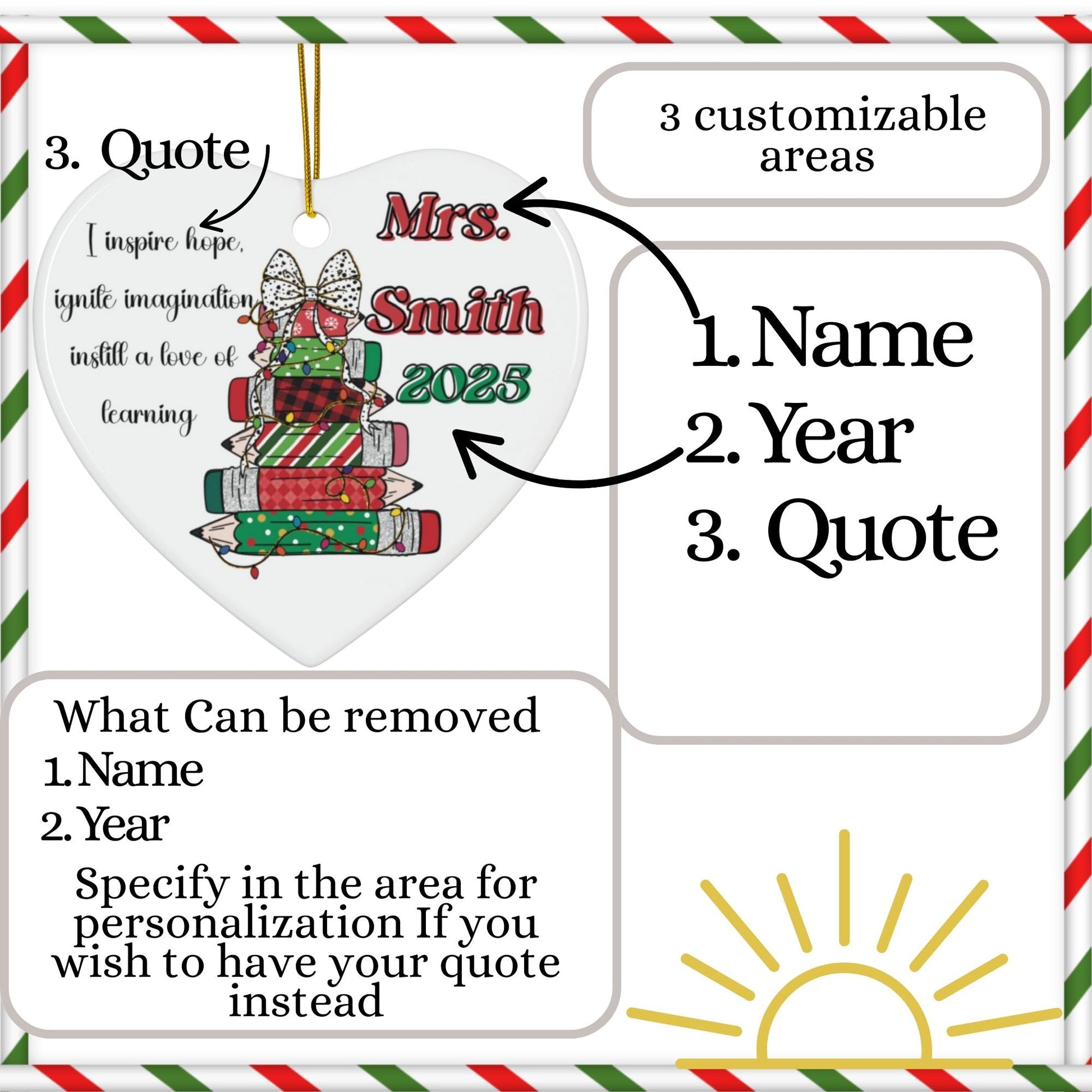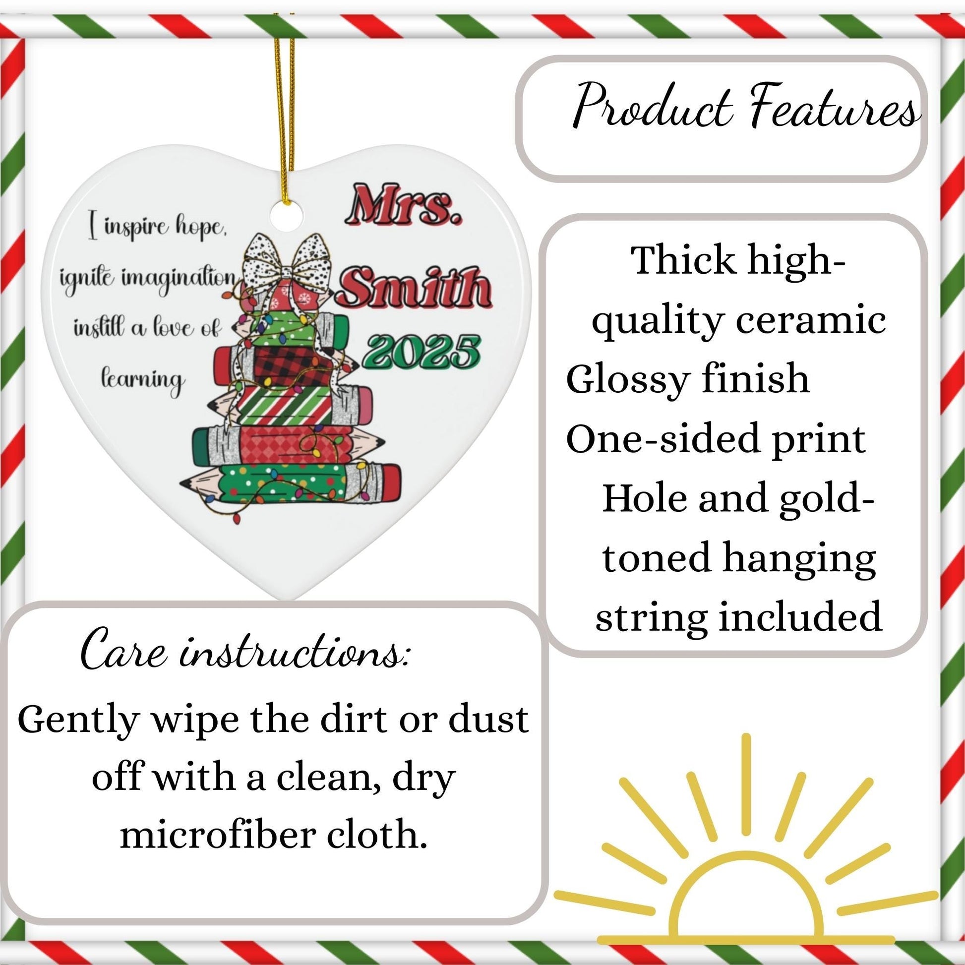 This Custom Christmas Teacher Name Holiday Appreciation ceramic heart-shaped ornament is a thoughtful way to celebrate educators during the holiday season. A perfect memory keepsake, it makes a meaningful gift for teachers to cherish year after year on their Christmas tree. ✨ Features: *Premium ceramic construction for lasting durability *Vibrant, fade-resistant design one sided *Includes ribbon for easy hanging *Size: 3.11" diameter (approx.) 🎁 Perfect For: *New teacher keepsake gifts *Special education teacher appreciation *Holiday classroom décor *End-of-year memory gifts * Elementary school teacher Care instructions - Gently wipe the dirt or dust off with a clean, dry microfiber cloth