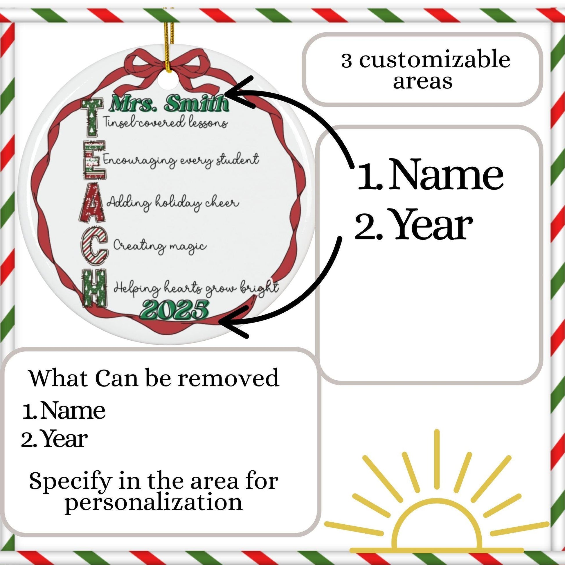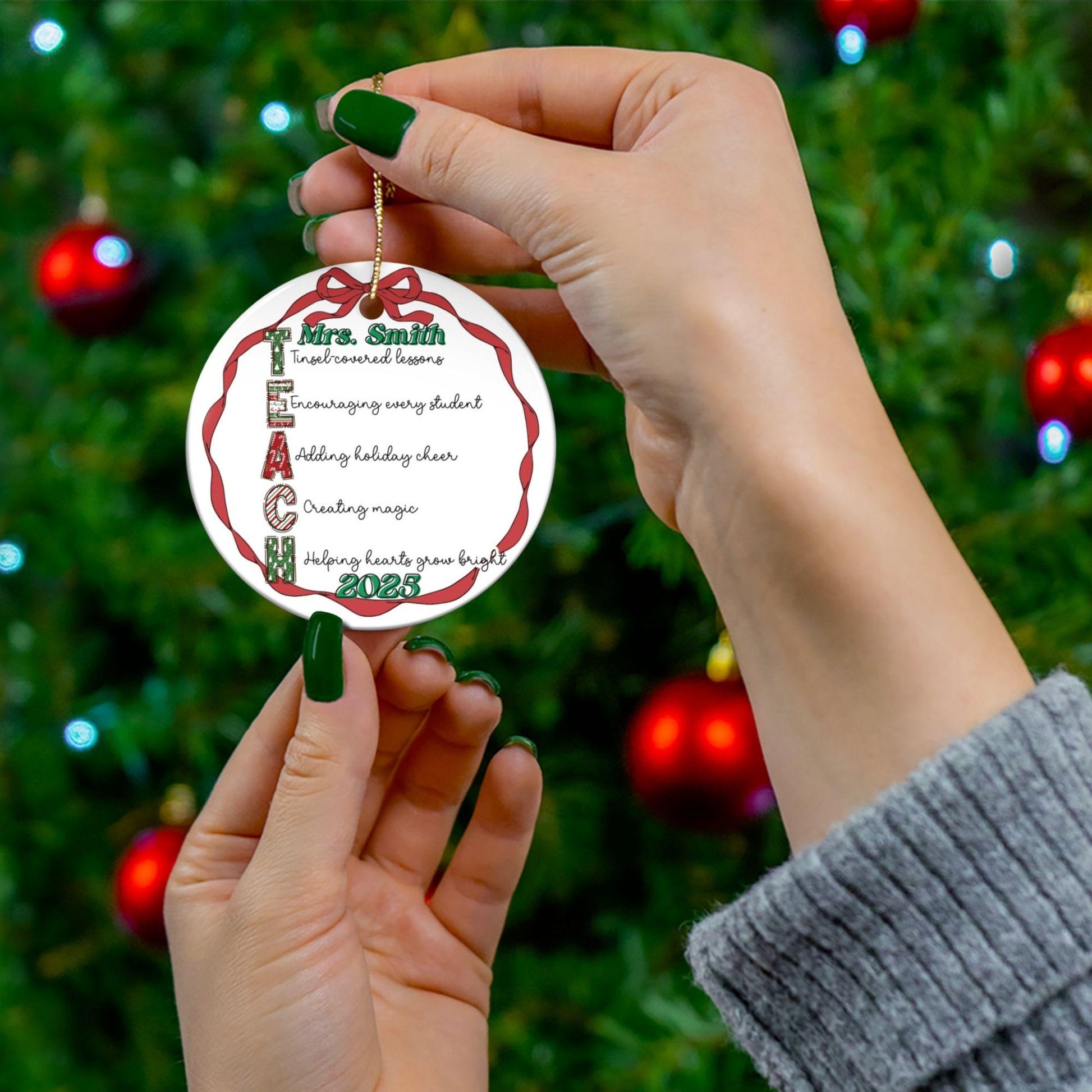 Custom Teach quote memory keepsake ornament gift idea for end of year classroom Christmas tree decor. Perfect for a new graduate teacher 2025 holiday celebration. ✨ Features: *Premium ceramic construction for lasting durability *Vibrant, fade-resistant design one sided *Includes ribbon for easy hanging *Size: 2.76" diameter (approx.) 🎁 Perfect For: *New teacher keepsake gifts *Special education teacher appreciation *Holiday classroom décor *End-of-year memory gifts * Elementary school teacher Care instructions - Gently wipe the dirt or dust off with a clean, dry microfiber cloth
