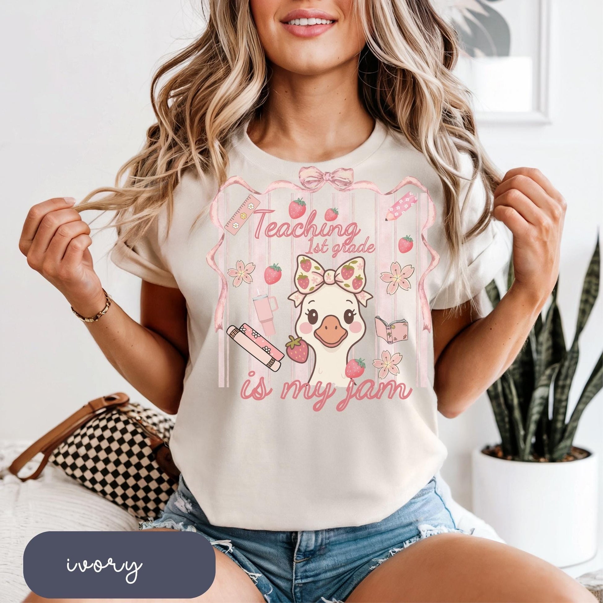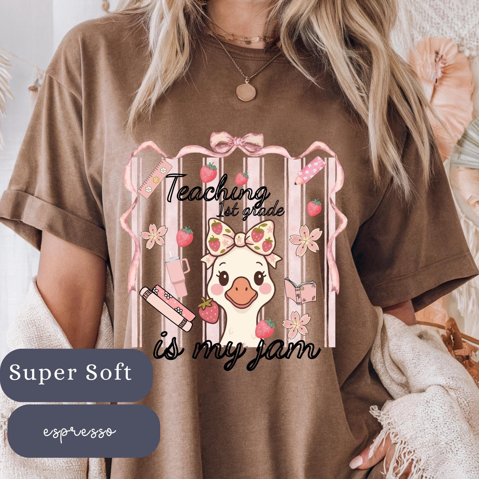This funny whimsical silly goose teacher tshirt is the perfect way to start the school year with a smile. Featuring "teaching is my jam," this back to school tee for new teachers makes a great fruit-themed elementary school educator gift idea. Product Features • Comfort Colors 1717 unisex relaxed fit • 100% ring-spun cotton for ultra-soft feel • Garment-dyed for a vintage, lived-in look • Double-stitched sleeves and bottom hem for durability • Soft-washed and pre-shrunk to minimize shrinkage • Available in multiple trendy colors • Printed with high-quality professional inks Perfect For Teacher Appreciation Week gifts • Teacher back to school t-shirt • Teacher new school year outfit • new elementary school educator • new school year • Comfortable everyday wear for Educators Sizing Information • True unisex relaxed fit — size down for a more fitted look or size up for an oversized style • Please refer to the size chart in listing photos for measurements • Model is wearing size Medium for a relaxed fit Care Instructions • Machine wash cold inside out • Tumble dry low or hang dry for best longevity • Do not bleach • Do not iron directly on design