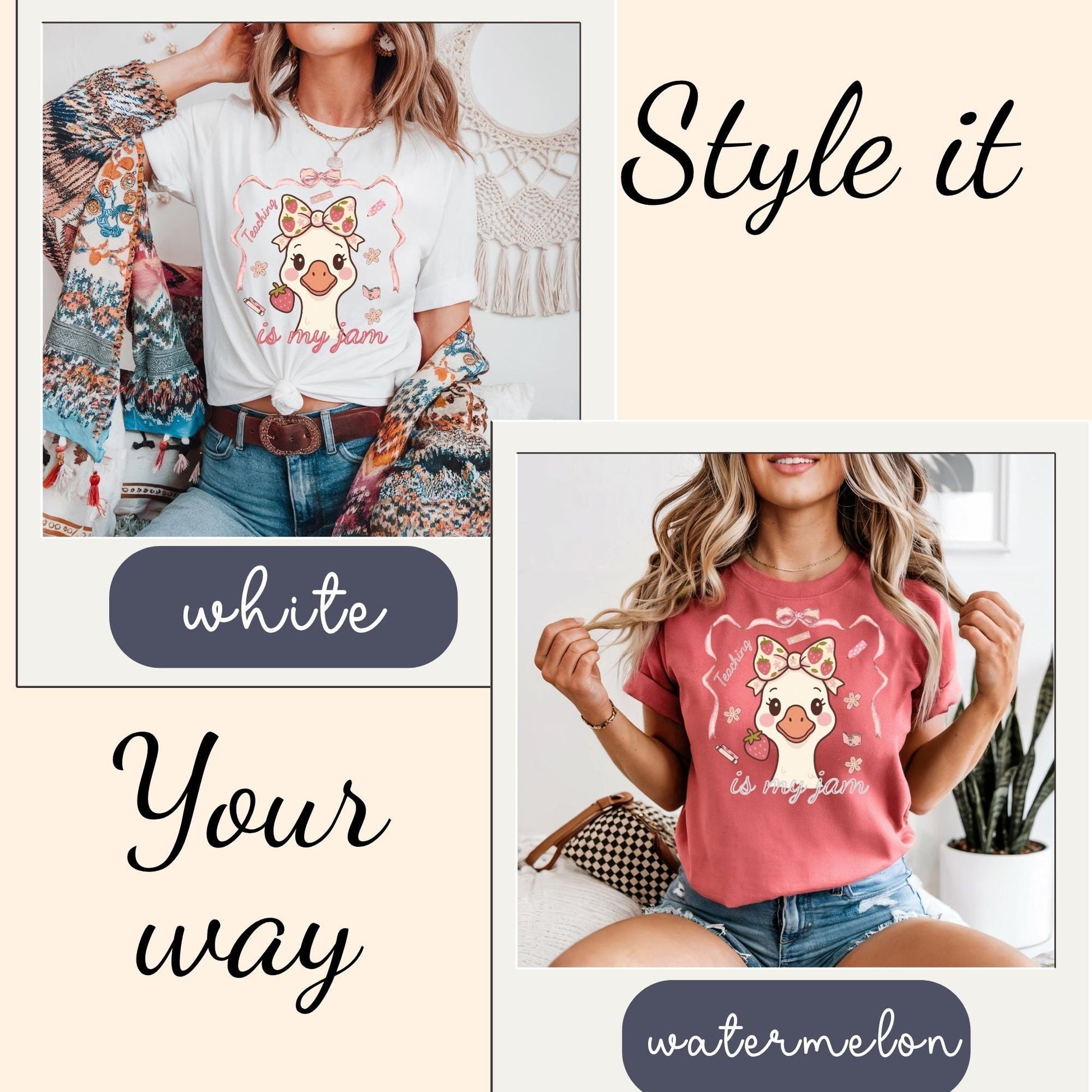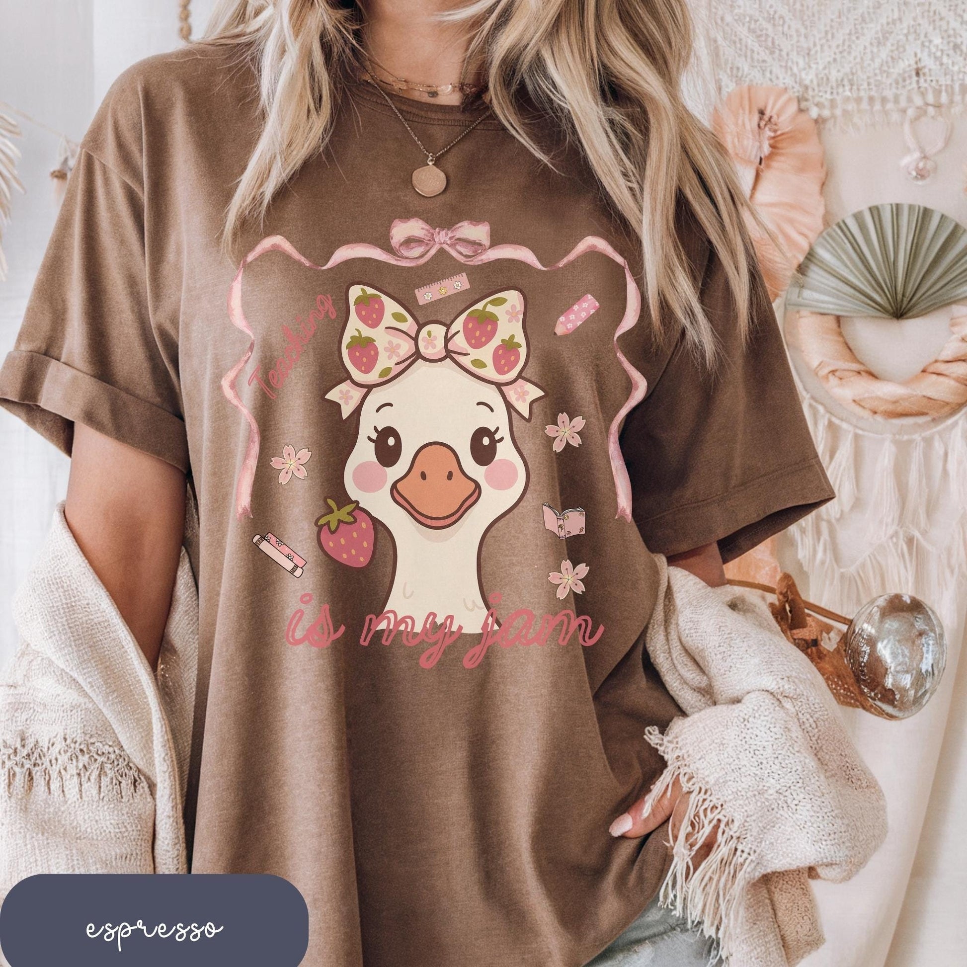 This funny silly goose teacher t-shirt is perfect for educators who love a playful style. Featuring a "Teaching Is My Jam" design, this Comfort Colors fruit shirt makes a great back to elementary school teacher gift idea. Product Features • Comfort Colors 1717 unisex relaxed fit • 100% ring-spun cotton for ultra-soft feel • Garment-dyed for a vintage, lived-in look • Double-stitched sleeves and bottom hem for durability • Soft-washed and pre-shrunk to minimize shrinkage • Available in multiple trendy colors • Printed with high-quality professional inks Perfect For Teacher Appreciation Week gifts • Teacher back to school t-shirt • Teacher new school year outfit • new elementary school educator • new school year • Comfortable everyday wear for Educators Sizing Information • True unisex relaxed fit — size down for a more fitted look or size up for an oversized style • Please refer to the size chart in listing photos for measurements • Model is wearing size Medium for a relaxed fit Care Instructions • Machine wash cold inside out • Tumble dry low or hang dry for best longevity • Do not bleach • Do not iron directly on design