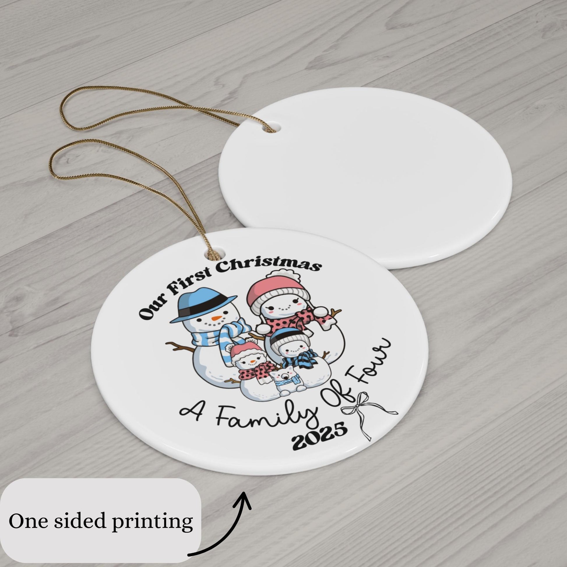 Family of four Christmas 2025 Ornament makes the perfect Personalized Holiday Decoration and Keepsake. This unique snowman gift idea is a special Christmas Tree ornament for parents of two in 2025. ✨ Features: *Premium ceramic construction for lasting durability *Vibrant, fade-resistant design one sided *Includes ribbon for easy hanging *Size: 2.76" diameter (approx.) 🎁 Perfect For: *New Mama keepsake gifts *New baby moms *Holiday home decor *End-of-year memory gifts * First christmas Care instructions - Gently wipe the dirt or dust off with a clean, dry microfiber cloth