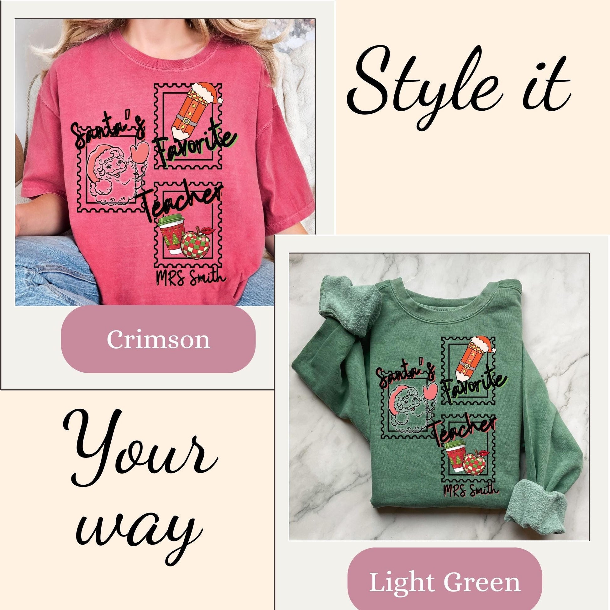 This Personalized Santa’s Favorite Teacher Christmas Comfort Colors® cotton sweatshirt is a festive and cozy way to celebrate the holiday season in style. Available in sizes S–3XL, it makes the perfect custom teacher Christmas gift or cheerful holiday outfit. Product Features T-Shirt • Comfort Colors 1717 unisex relaxed fit • 100% ring-spun cotton for ultra-soft feel • Garment-dyed for a vintage, lived-in look • Double-stitched sleeves and bottom hem for durability • Soft-washed and pre-shrunk to minimize shrinkage • Available in multiple trendy colors • Printed with high-quality professional inks Product features Sweatshirt: - 1x1 ribbed collar, cuffs, and bottom hem for a perfect fit - Necktape stabilizes the seam for enhanced comfort - Special back detail with a half-moon neck patch - Soft, luxurious fabric blend of 80% cotton and 20% polyester - Available with custom embroidery for personal touches Perfect For Christmas/ Winter Teacher • Teacher Name school t-shirt/Sweatshirt • Teacher new school year outfit • new elementary school educator • Christmas Shirt attire • Comfortable everyday wear for Educators Sizing Information • True unisex relaxed fit — size down for a more fitted look or size up for an oversized style • Please refer to the size chart in listing photos for measurements • Model is wearing size Medium for a relaxed fit Care Instructions • Machine wash cold inside out • Tumble dry low or hang dry for best longevity • Do not bleach • Do not iron directly on design
