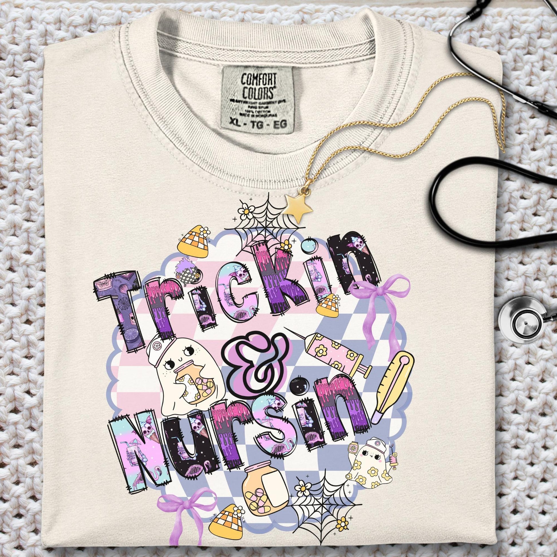 RN LPN nurse cute trickin ghost shirt is a fun gift idea for new nurse Halloween celebration tee for fall. Perfect for matching work apparel and a coquette spooky top nurses will love during spooky season. Product Features • Comfort Colors 1717 unisex relaxed fit • 100% ring-spun cotton for ultra-soft feel • Garment-dyed for a vintage, lived-in look • Double-stitched sleeves and bottom hem for durability • Soft-washed and pre-shrunk to minimize shrinkage • Available in multiple trendy colors • Printed with high-quality professional inks Perfect For • Nurse Halloween • School nurse • Registered nurse • Fall nurse outfit • LPN RN Nurse • Comfortable everyday wear for healthcare workers Sizing Information • True unisex relaxed fit — size down for a more fitted look or size up for an oversized style • Please refer to the size chart in listing photos for measurements • Model is wearing size Medium for a relaxed fit Care Instructions • Machine wash cold inside out • Tumble dry low or hang dry for best longevity • Do not bleach • Do not iron directly on design