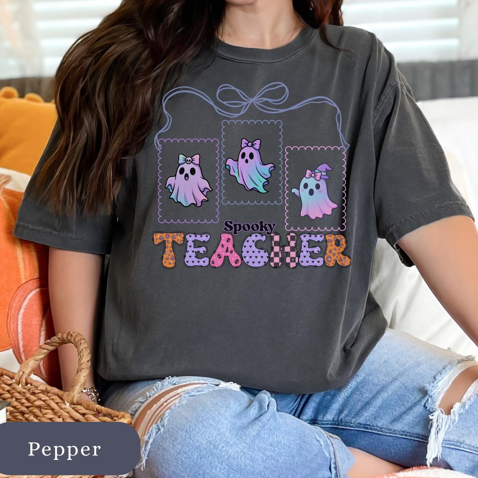 This Spooky Cute Ghost Teacher T-Shirt is perfect for a Halloween party matching educator tee for elementary school teacher fall celebrations. It also makes a fun Halloween costume shirt for pre-k teachers who love festive and themed apparel. Product Features • Comfort Colors 1717 unisex relaxed fit • 100% ring-spun cotton for ultra-soft feel • Garment-dyed for a vintage, lived-in look • Double-stitched sleeves and bottom hem for durability • Soft-washed and pre-shrunk to minimize shrinkage • Available in multiple trendy colors • Printed with high-quality professional inks Perfect For Halloween Fall Autumn Teacher • Teacher back to school t-shirt • Teacher new school year outfit • new elementary school educator • new school year • Comfortable everyday wear for Educators Sizing Information • True unisex relaxed fit — size down for a more fitted look or size up for an oversized style • Please refer to the size chart in listing photos for measurements • Model is wearing size Medium for a relaxed fit Care Instructions • Machine wash cold inside out • Tumble dry low or hang dry for best longevity • Do not bleach • Do not iron directly on design