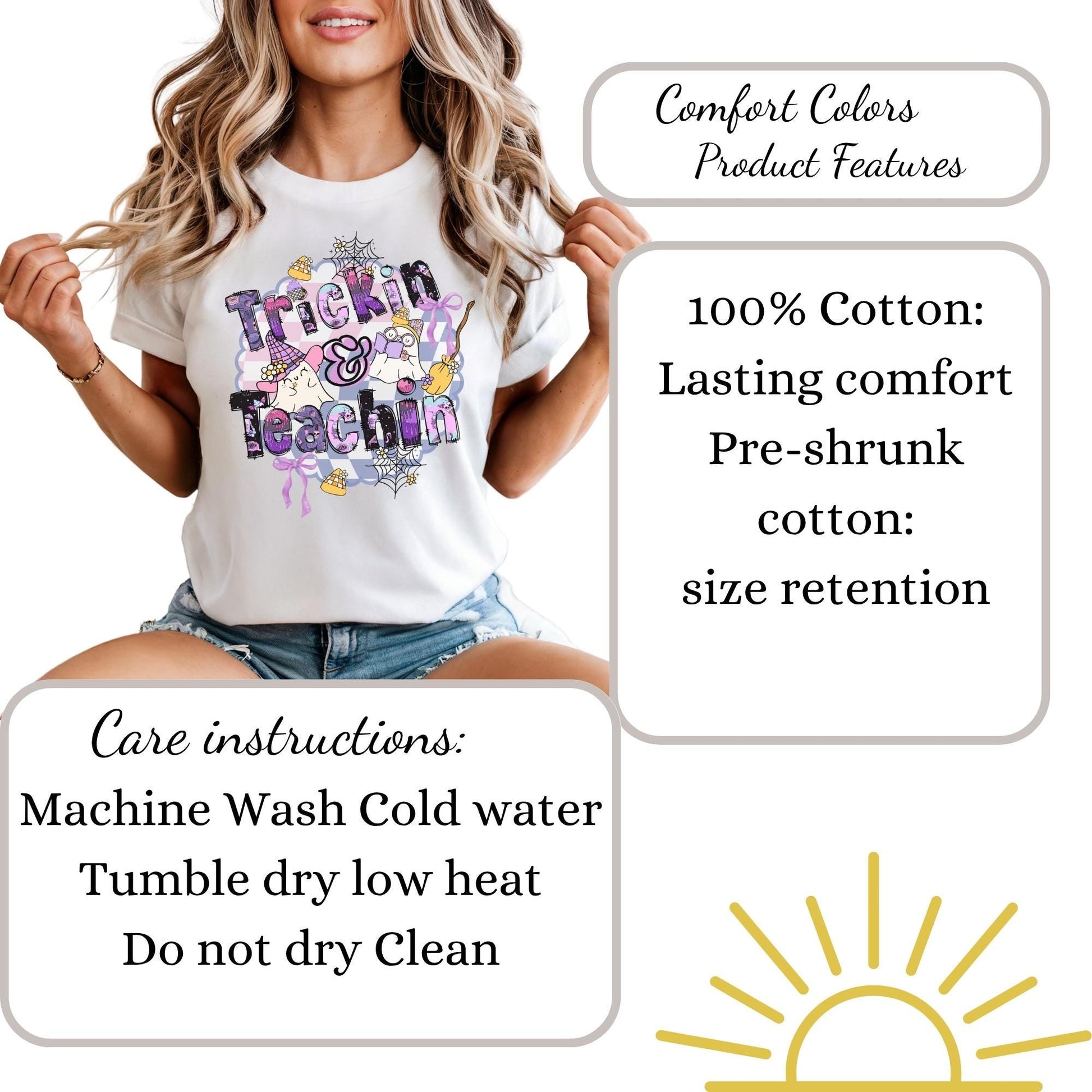 Trickin cute spooky ghost teacher tshirt for elementary, first grade, and new teacher tee. Halloween autumn coquette matching shirt for fall gift. Product Features • Comfort Colors 1717 unisex relaxed fit • 100% ring-spun cotton for ultra-soft feel • Garment-dyed for a vintage, lived-in look • Double-stitched sleeves and bottom hem for durability • Soft-washed and pre-shrunk to minimize shrinkage • Available in multiple trendy colors • Printed with high-quality professional inks Perfect For Halloween Fall Autumn Teacher • Teacher back to school t-shirt • Teacher new school year outfit • new elementary school educator • new school year • Comfortable everyday wear for Educators Sizing Information • True unisex relaxed fit — size down for a more fitted look or size up for an oversized style • Please refer to the size chart in listing photos for measurements • Model is wearing size Medium for a relaxed fit Care Instructions • Machine wash cold inside out • Tumble dry low or hang dry for best longevity • Do not bleach • Do not iron directly on design