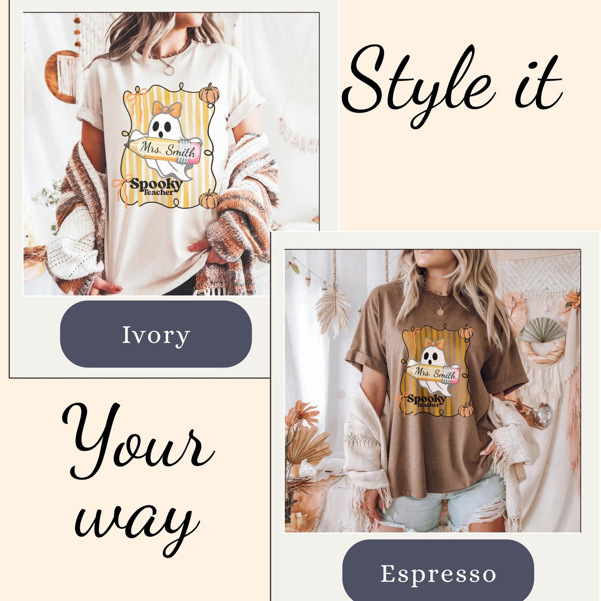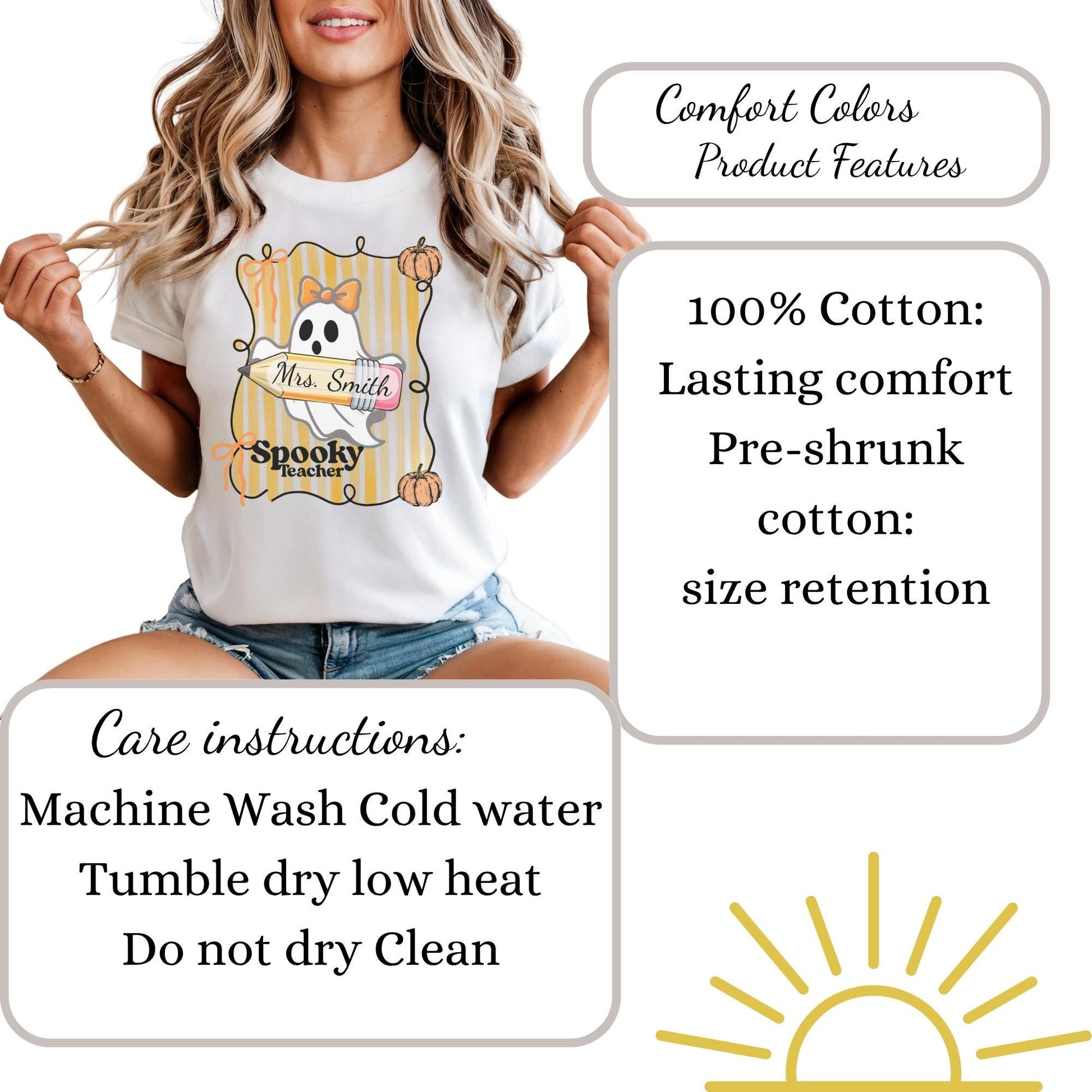 This spooky retro cute ghost teacher t-shirt for Halloween is the perfect coquette custom tee for educators. Great for Halloween party matching shirts for kindergarten and school staff! Product Features • Comfort Colors 1717 unisex relaxed fit • 100% ring-spun cotton for ultra-soft feel • Garment-dyed for a vintage, lived-in look • Double-stitched sleeves and bottom hem for durability • Soft-washed and pre-shrunk to minimize shrinkage • Available in multiple trendy colors • Printed with high-quality professional inks Perfect For Halloween Fall Autumn Teacher • Teacher back to school t-shirt • Teacher new school year outfit • new elementary school educator • new school year • Comfortable everyday wear for Educators Sizing Information • True unisex relaxed fit — size down for a more fitted look or size up for an oversized style • Please refer to the size chart in listing photos for measurements • Model is wearing size Medium for a relaxed fit Care Instructions • Machine wash cold inside out • Tumble dry low or hang dry for best longevity • Do not bleach • Do not iron directly on design