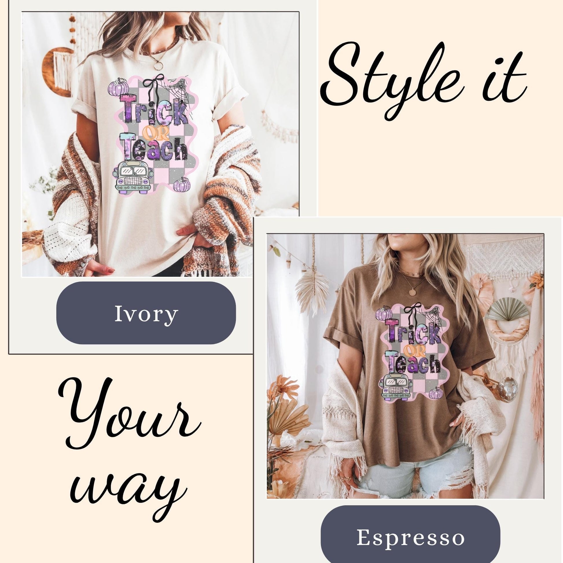 Halloween themed Trick or Teach teacher t-shirt for Halloween school party. Match tees for educators, elementary, and kindergarten teachers shirt. Product Features • Comfort Colors 1717 unisex relaxed fit • 100% ring-spun cotton for ultra-soft feel • Garment-dyed for a vintage, lived-in look • Double-stitched sleeves and bottom hem for durability • Soft-washed and pre-shrunk to minimize shrinkage • Available in multiple trendy colors • Printed with high-quality professional inks Perfect For Halloween Fall Autumn Teacher • Teacher back to school t-shirt • Teacher new school year outfit • new elementary school educator • new school year • Comfortable everyday wear for Educators Sizing Information • True unisex relaxed fit — size down for a more fitted look or size up for an oversized style • Please refer to the size chart in listing photos for measurements • Model is wearing size Medium for a relaxed fit Care Instructions • Machine wash cold inside out • Tumble dry low or hang dry for best longevity • Do not bleach • Do not iron directly on design